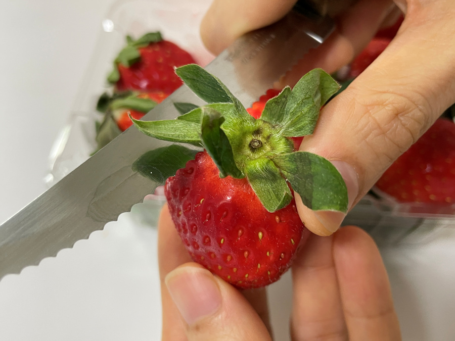 그렇기 때문에 딸기 꼭지를 반드시 손으로 떼서 과육이 다치지 않게 해주세요.