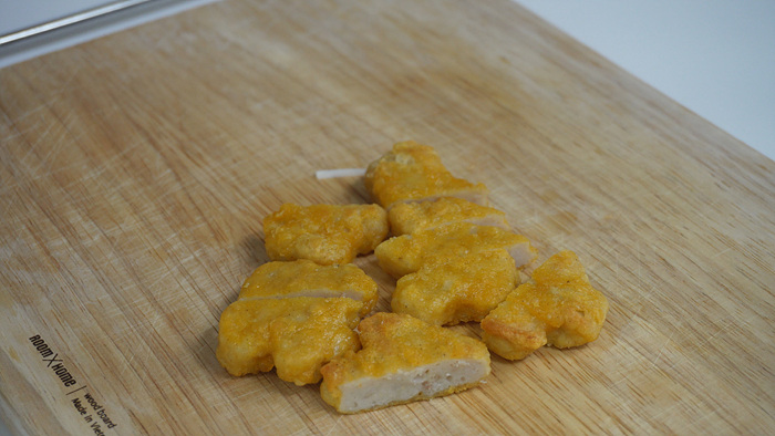 그 다음 치킨텐더 조각을 올려주세요. 치킨조각은 원하시는 만큼 사용하시면 돼요. 다만 양이 과도하게 많아지지 않게 주의하세요 😀